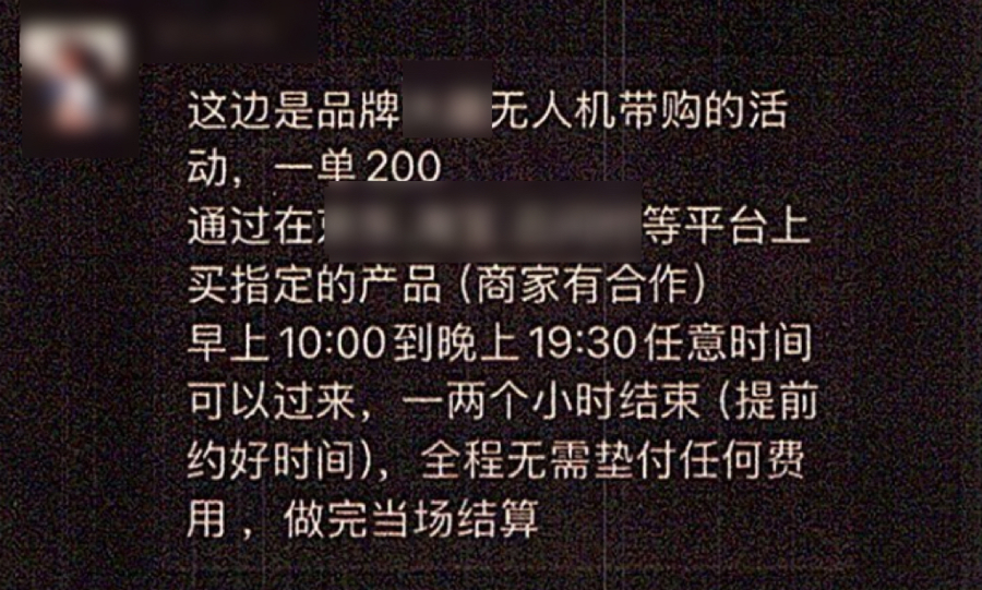 今年9月2日赢正通,上海市公安局杨浦分局反诈专班接到辖区银行工作人员反映,有一名刚刚大学毕业的年轻人坚持要新开银行账户用于“无人机代购”兼职,可能遭遇诈骗。经民警询问了解,小刘在网上被一则“无人机代购获高额佣金”的兼职招聘广告所吸引,对方称仅需使用某购物平台优惠额度代购一台品牌无人机,即可获得350元佣金。小刘信以为真与对方取得联系,并根据要求在银行开通全新账户后,由对方线下操作所谓的“代购”流程。